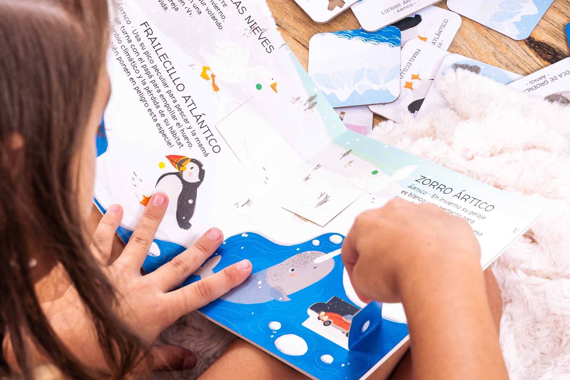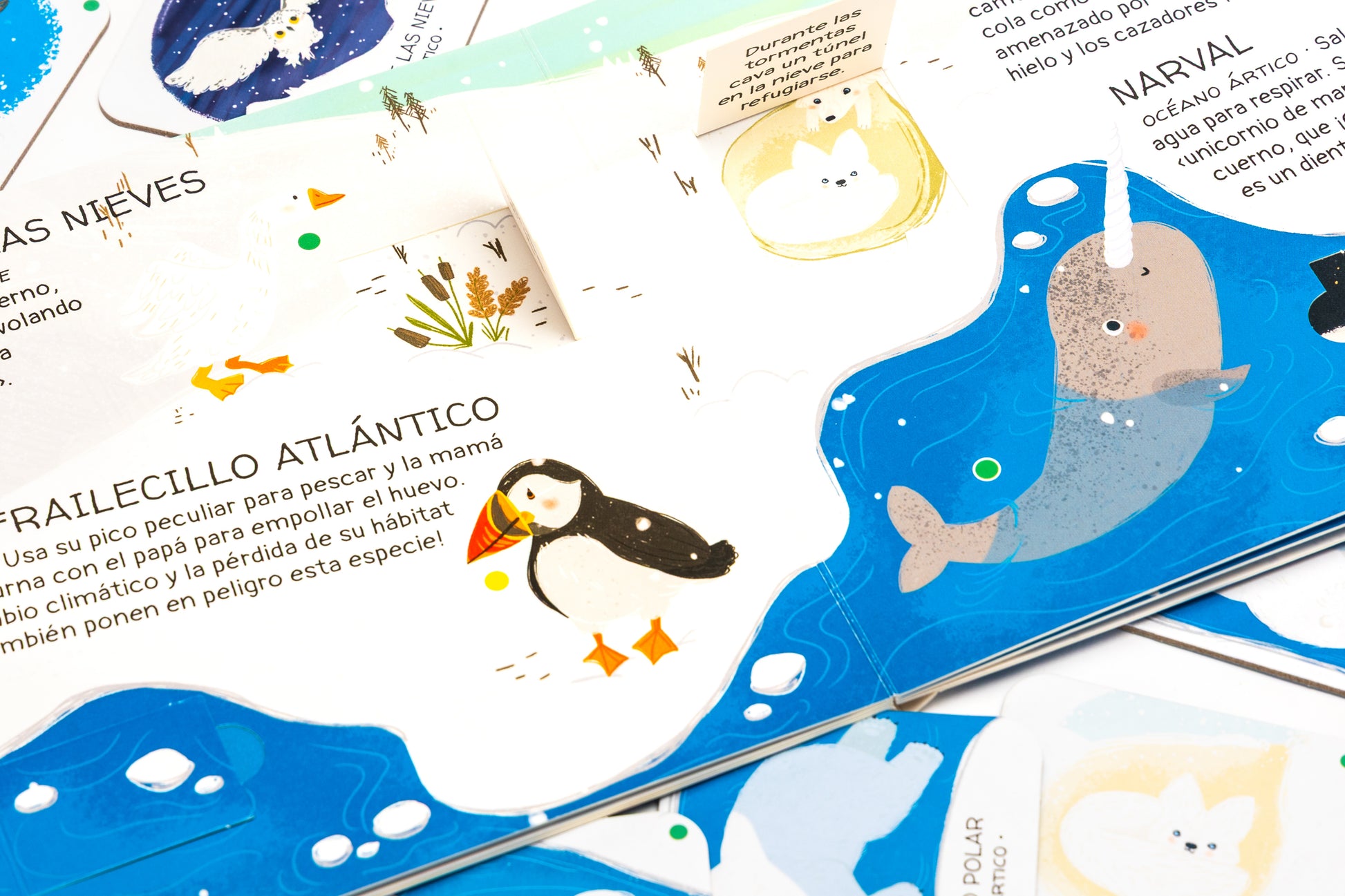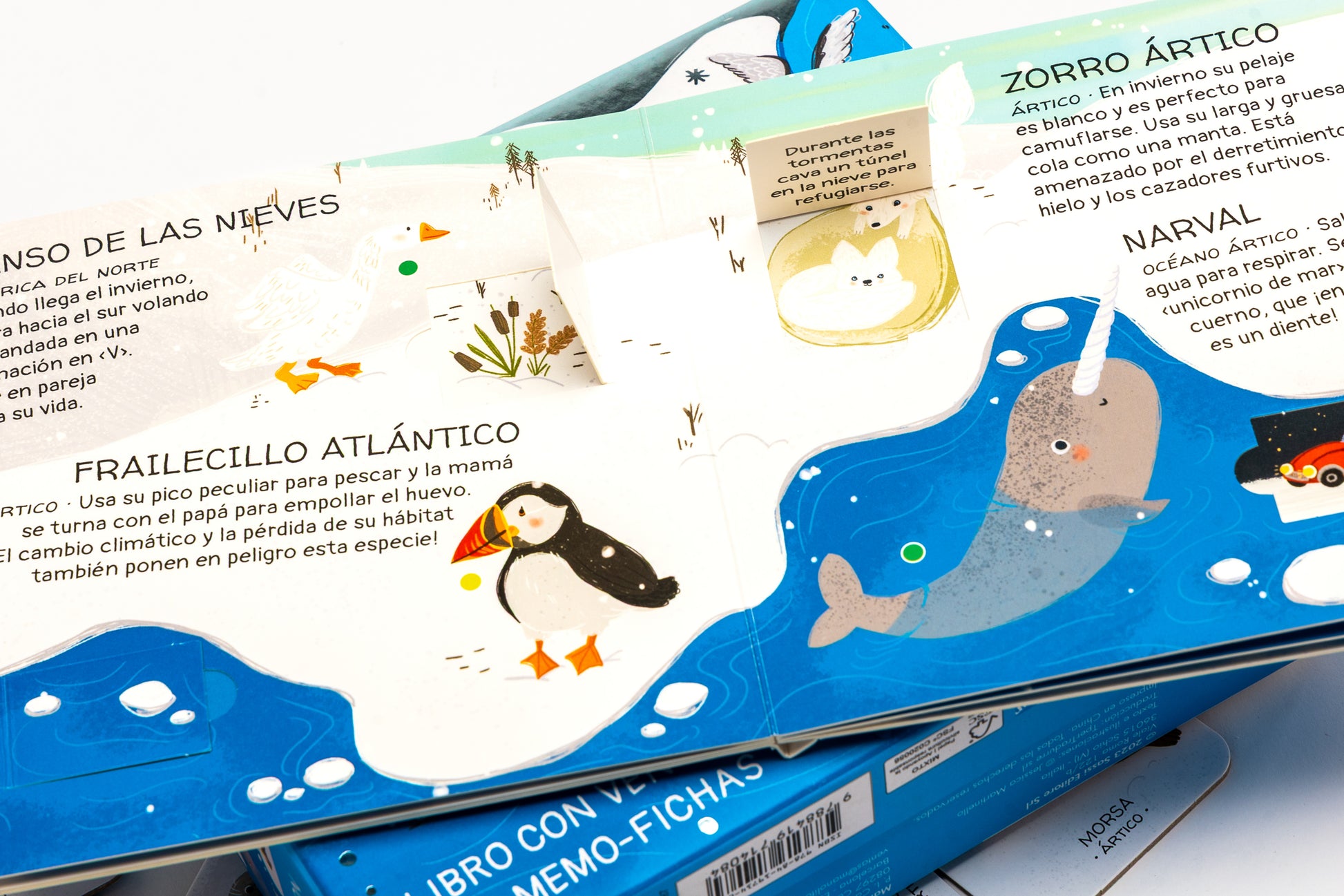 Levanta las ventanitas del interior del libro y descubre un montón de datos interesantes sobre los animales de los Polos, el entorno en el que viven y por qué están en peligro de extinción. Juega después con las fichas y entrena tu memoria. Un libro-
