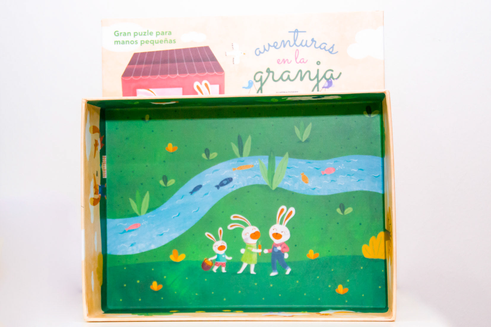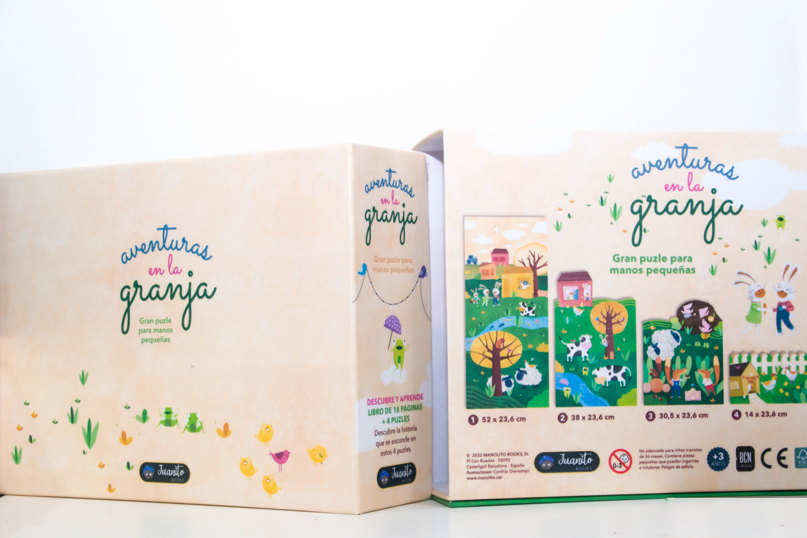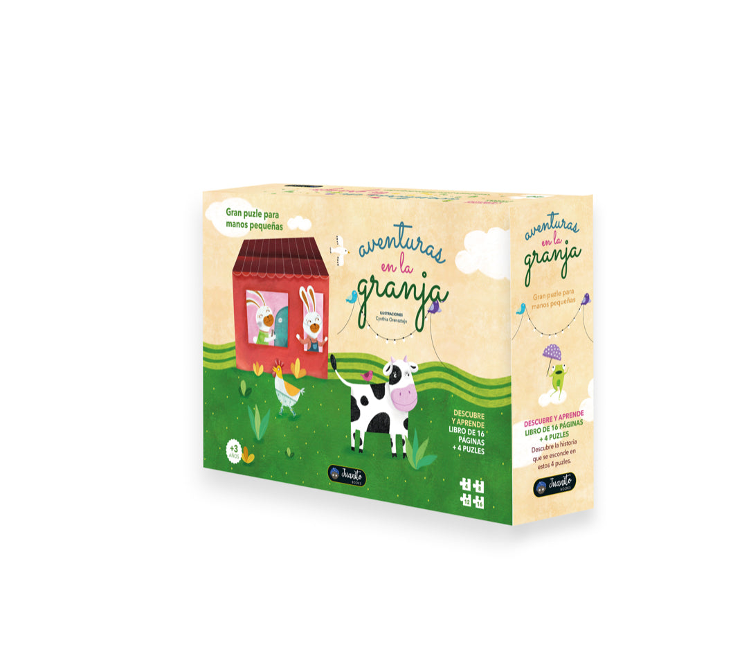 Completa los 4 rompecabezas, coloca uno encima del otro y descubre cómo es un día en esta preciosa granja, donde los animales se divierten.