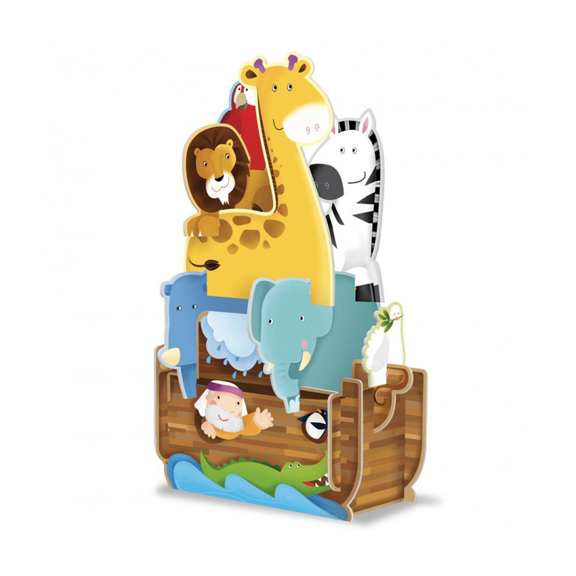 ¡Construye una fantástica arca de Noé y descubre los animales que se salvaron del diluvio universal! Encaja la cebra sobre el elefante, la jirafa sobre el rinoceronte… y todos los demás animales del arca. Completa la construcción con una bonita palom