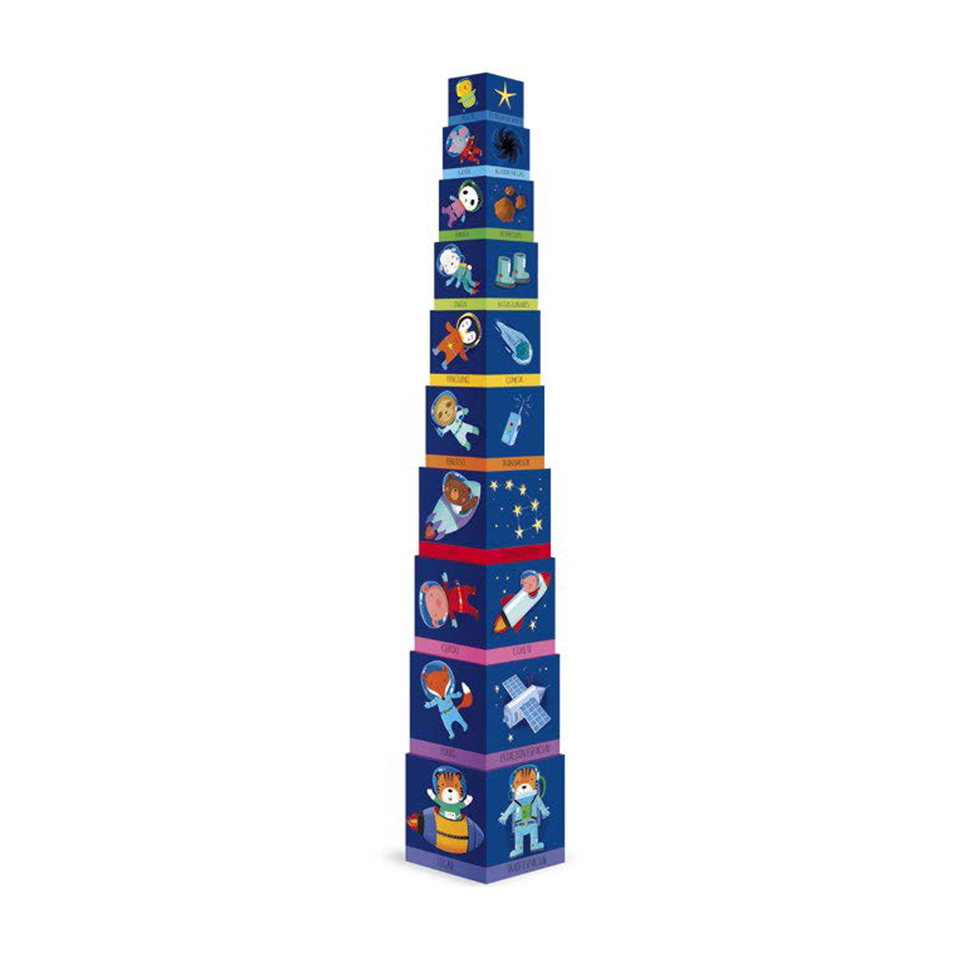 Un librito colorido y cautivador que enseñará a los más pequeños los conceptos clave del aprendizaje junto a los colores, las estrellas y los planetas. Diez cubos ilustrados para construir una torre y hacer más divertido e interactivo el aprendizaje
