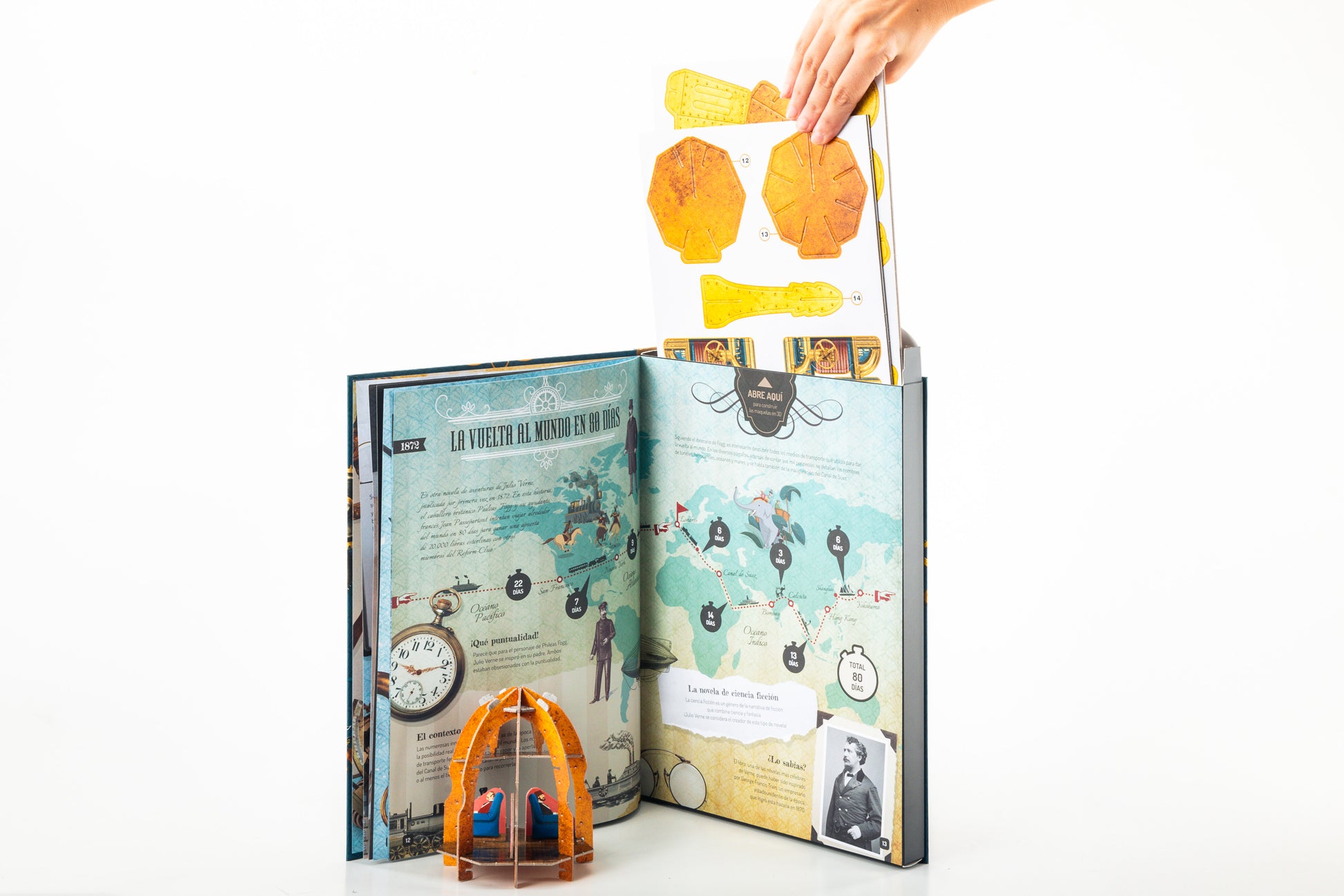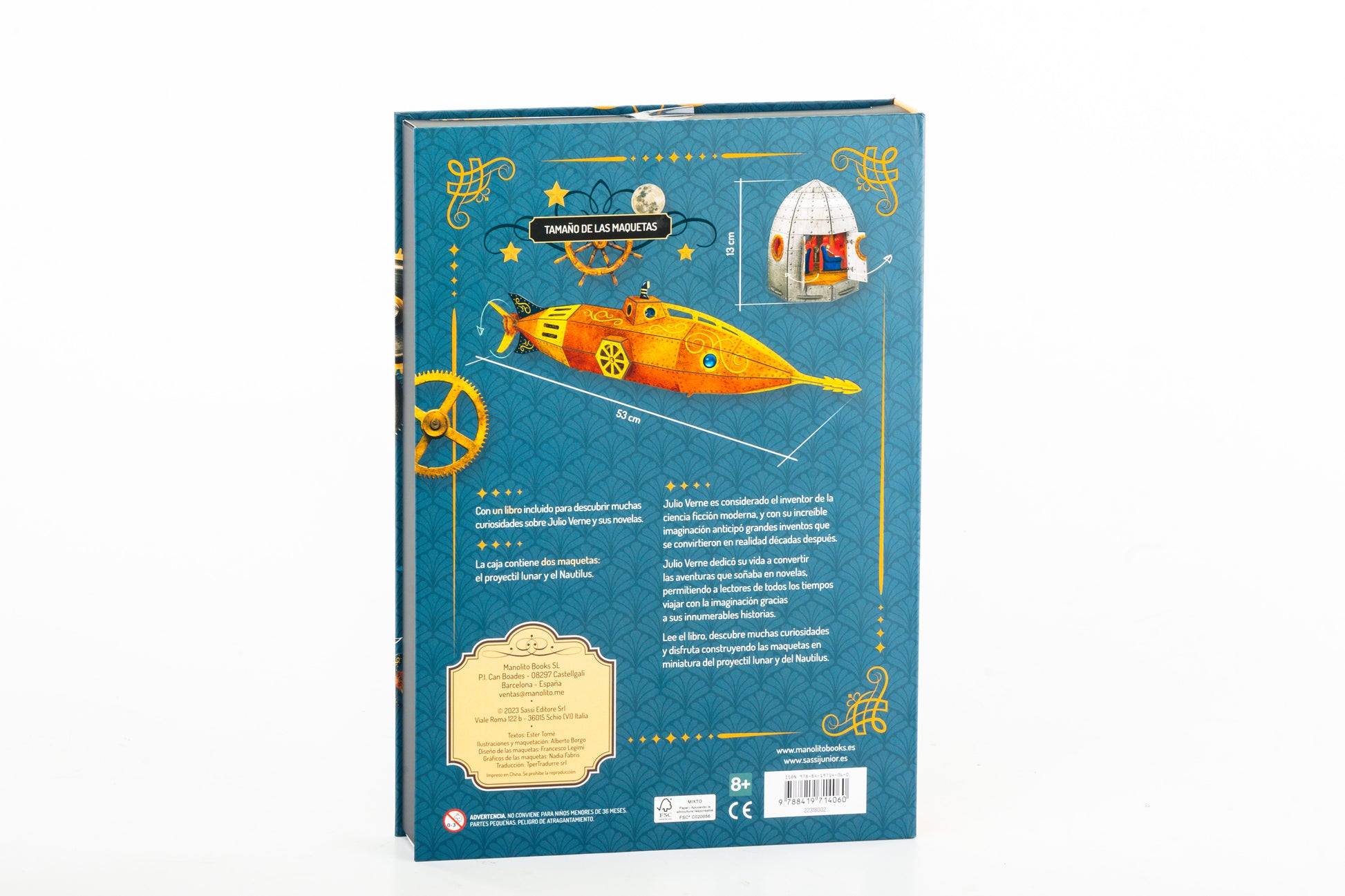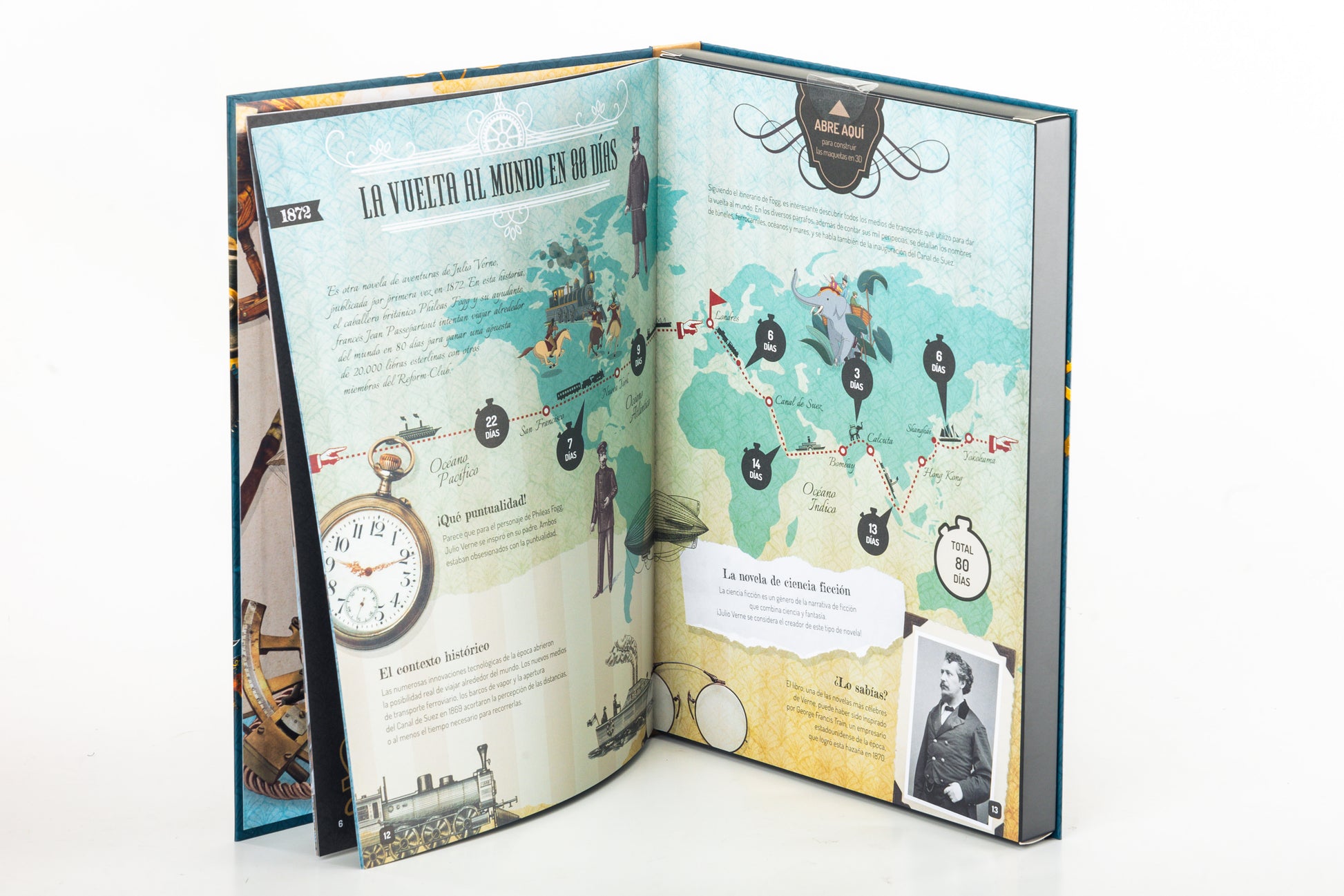 Julio Verne es uno de los escritores más queridos de la historia y sus novelas se siguen leyendo y traduciendo en todo el mundo. Se le considera el inventor de la ciencia ficción moderna y con su imaginación anticipó muchos grandes inventos que llegaron décadas después. Julio Verne dedicó su vida a plasmar en novelas las aventuras que soñaba, permitiendo a los lectores de todos los tiempos viajar con la imaginación gracias a sus numerosos libros. Lee el libro, descubre muchos datos interesantes y diviértete construyendo maquetas en miniatura del Proyectil Lunar y el Nautilus.