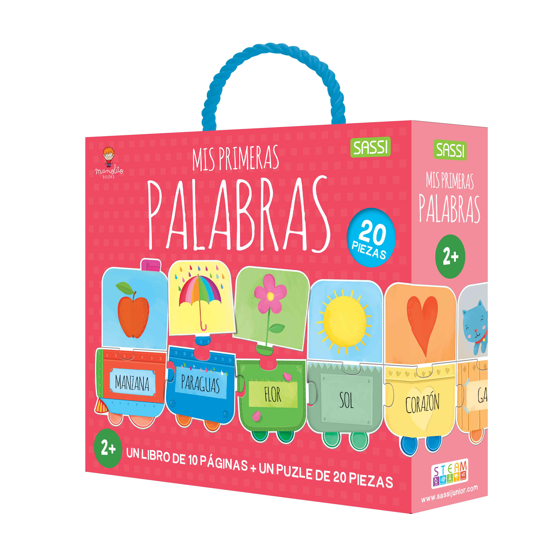 Un libro de 10 páginas y un rompecabezas gigante de 20 piezas para crear un tren de juguete y aprender las primeras palabras. Un libro de 10 páginas y un puzle de 20 piezas gigantes para crear un tren capaz de estimular el aprendizaje.