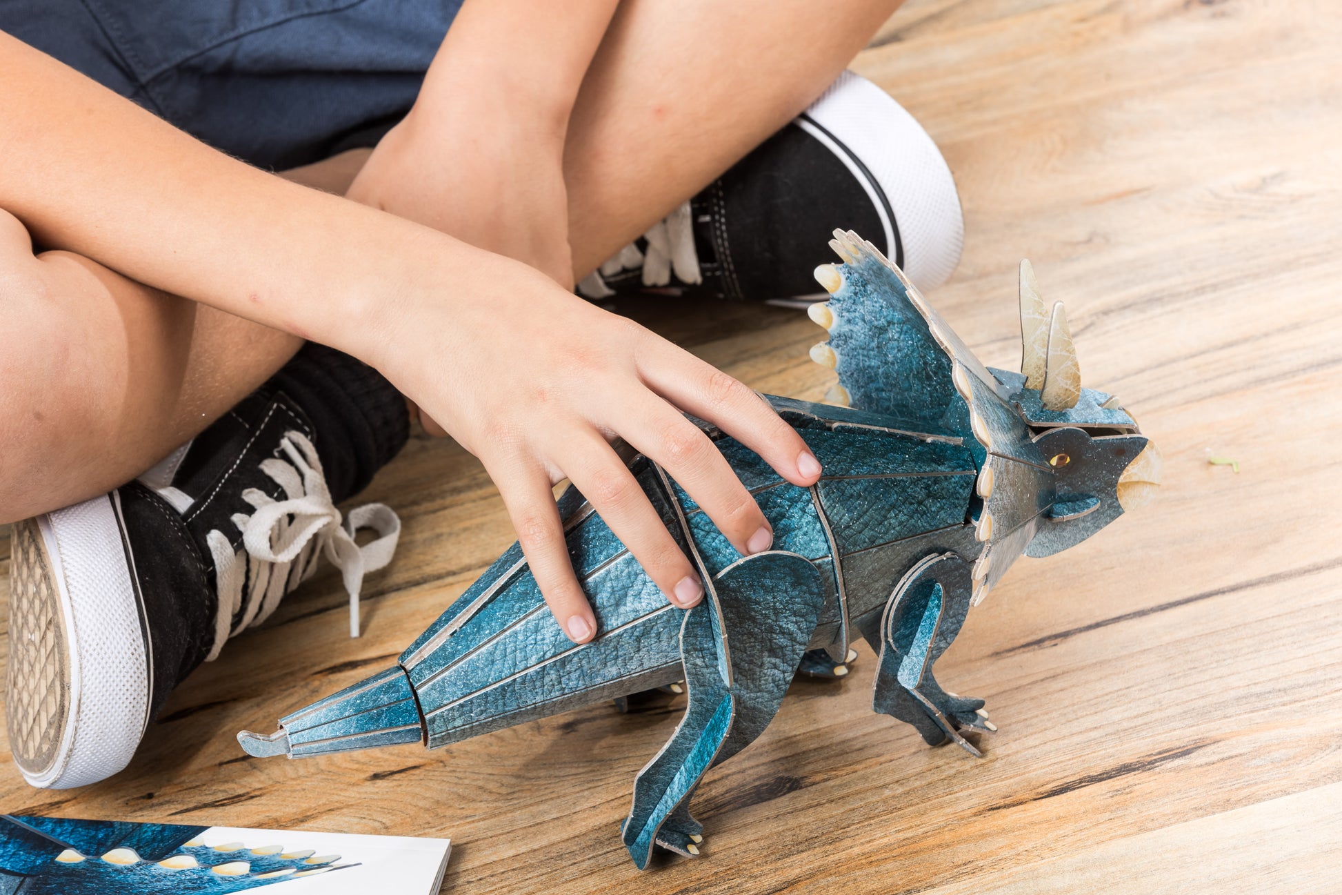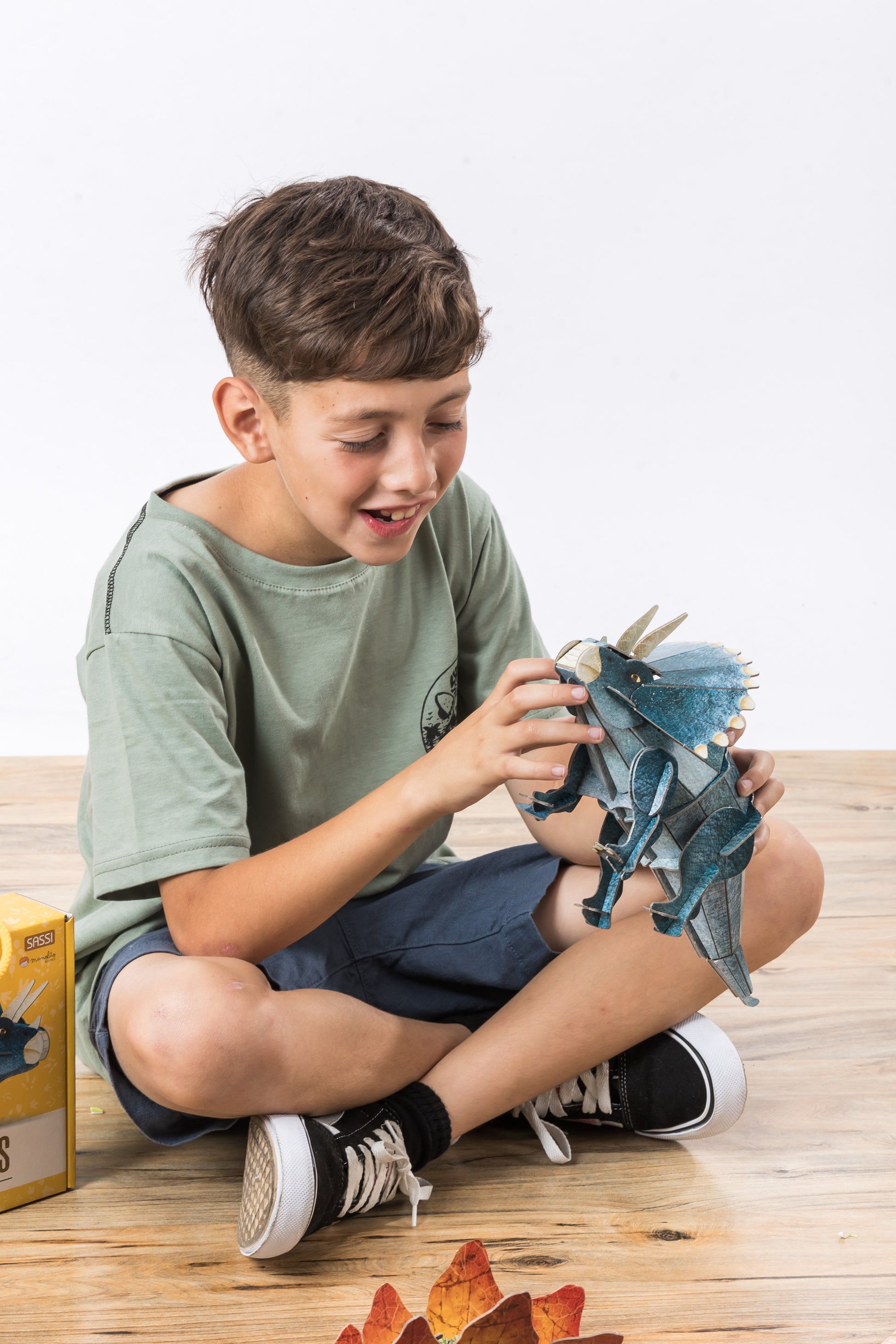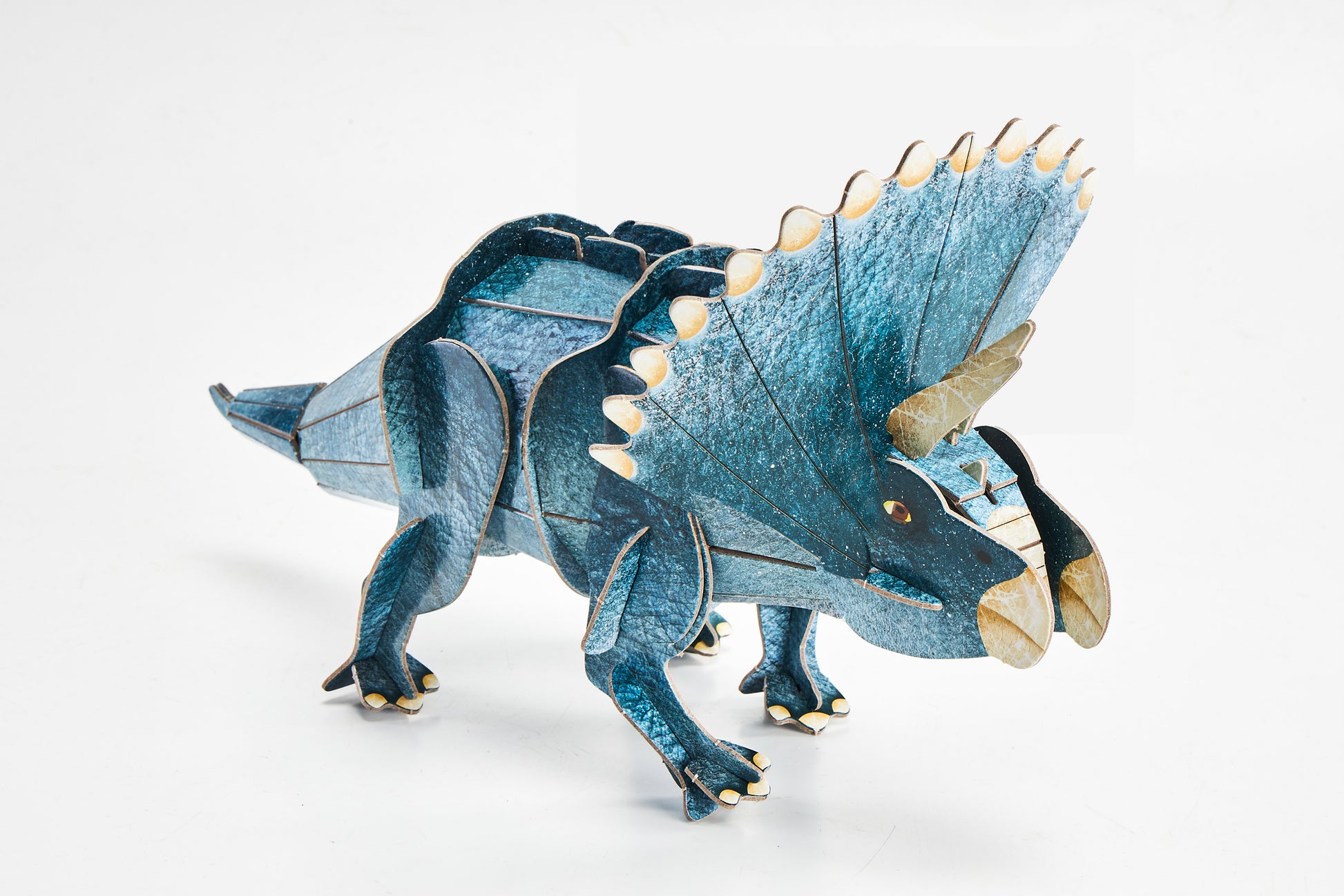 El Tricerátops es uno de los animales más conocidos de la Era Mesozoica. ¡Era realmente único! El Tricerátops tiene un gran cuerno en su hocico y dos cuernos más largos por encima de sus ojos. ¡Y un gran volante óseo en la base de su cráneo parecido a una corona!